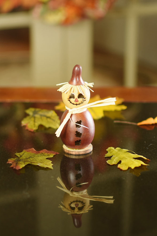 • The Winfield Gourd has an adorable scarecrow face, mahogany in color with three leaves cut out. He is approximately 4.5 inches tall.