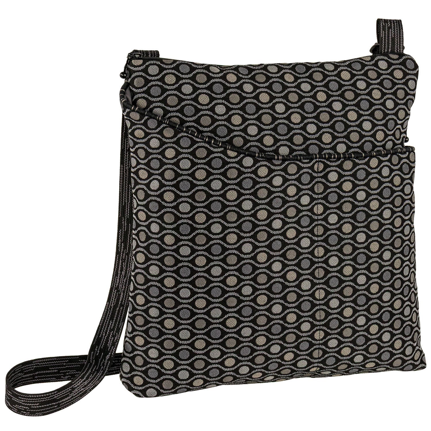 Larger Sling…will hold an iPad! Generous main compartment with small interior pocket. Two separate open exterior pockets, one with a small open interior pocket. Soft adjustable custom strap. Great for travel!