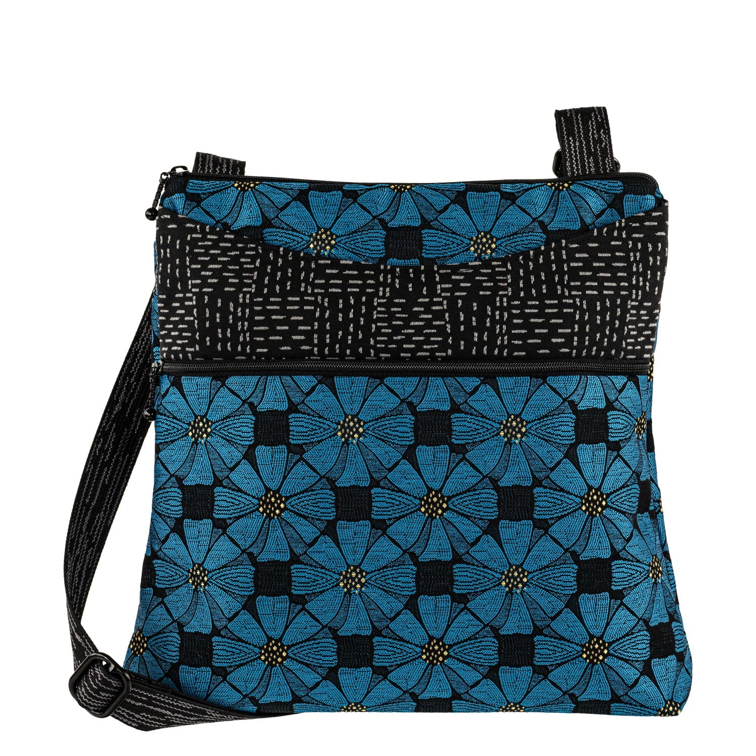 A top Favorite! The perfect big little bag! Soft adjustable custom strap! Generous interior, with small open pocket for lippy-goos. Top shallow open exterior pocket for quick easy access. Front zipped pocket. Generous open pocket on back, will hold a water bottle, great bag!