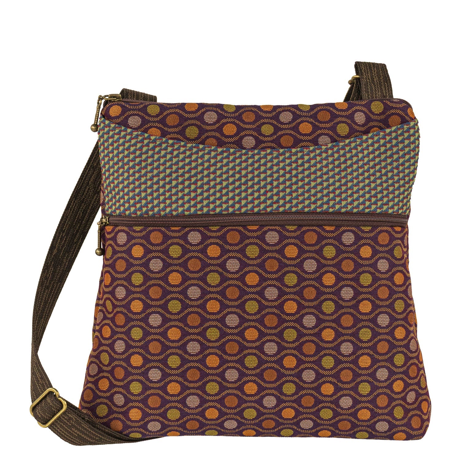 A top Favorite! The perfect big little bag! Soft adjustable custom strap! Generous interior, with small open pocket for lippy-goos. Top shallow open exterior pocket for quick easy access. Front zipped pocket. Generous open pocket on back, will hold a water bottle, great bag!