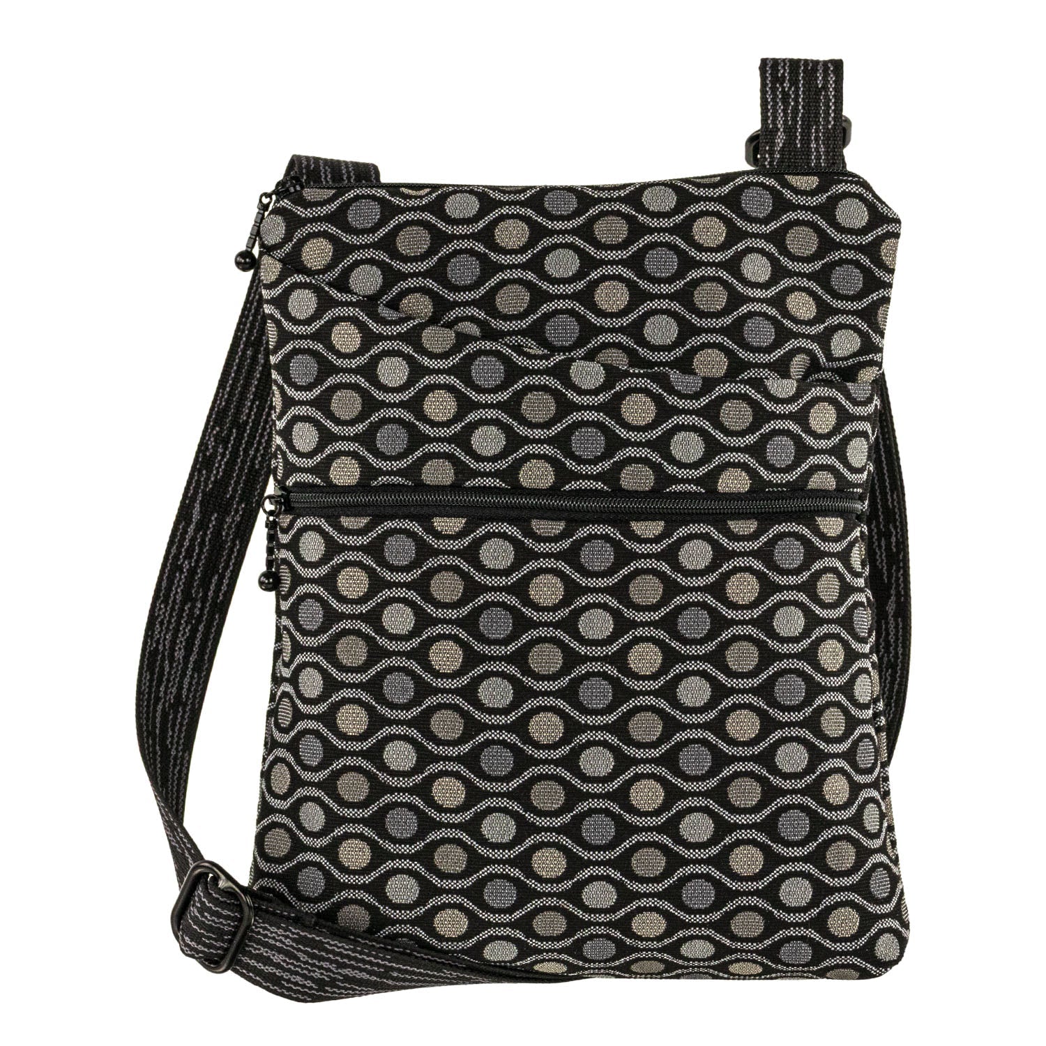 Flat, sleek and compact... all with an adjustable 1” custom web strap! Interior also has an additional small pocket. Exterior...top open pocket for quick access aaaand a zipped pocket for secure needs. Will fit iPad mini and eReaders