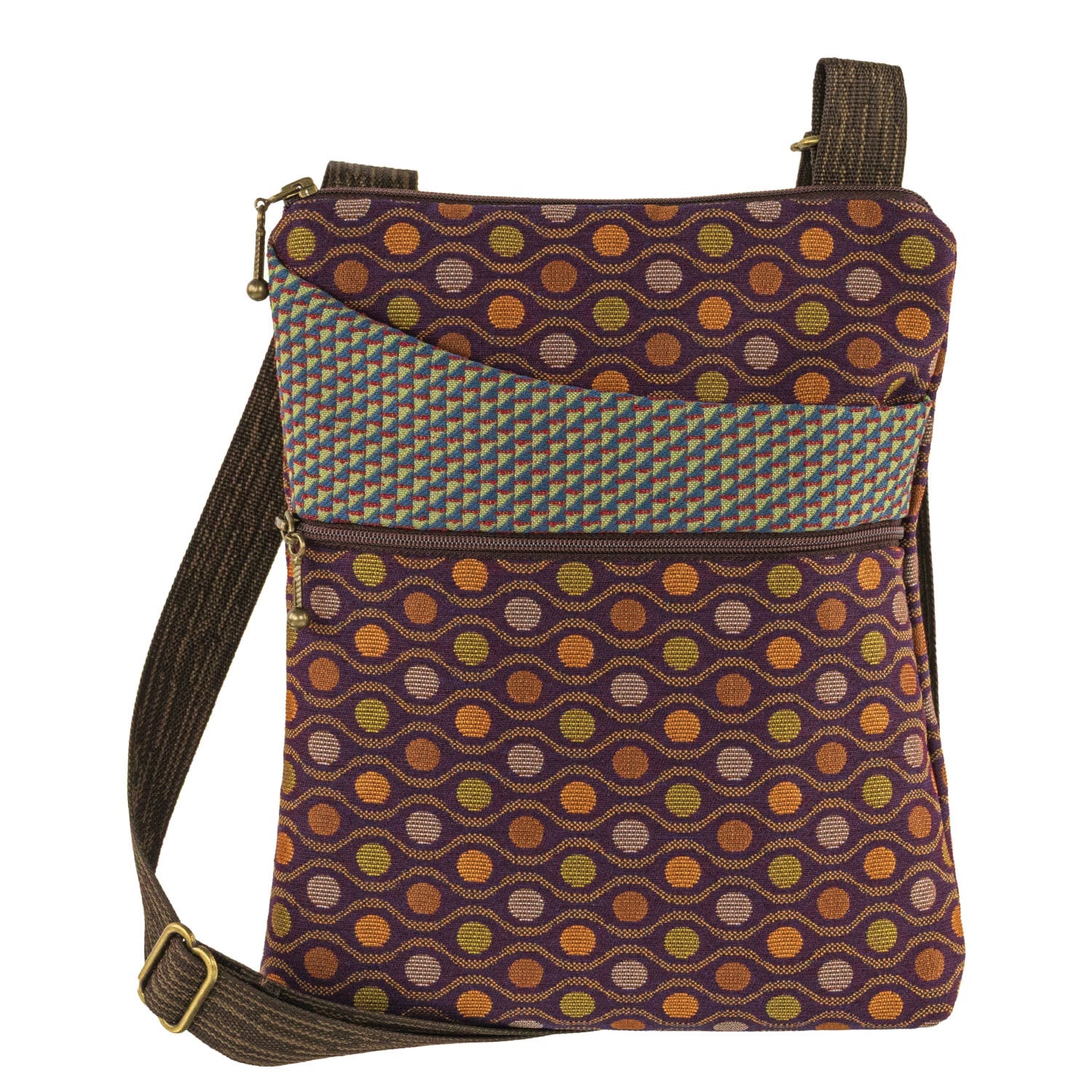 Flat, sleek and compact... all with an adjustable 1” custom web strap! Interior also has an additional small pocket. Exterior...top open pocket for quick access aaaand a zipped pocket for secure needs. Will fit iPad mini and eReaders