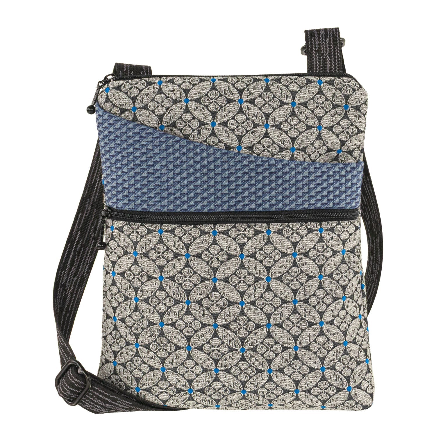 Flat, sleek and compact... all with an adjustable 1” custom web strap! Interior also has an additional small pocket. Exterior...top open pocket for quick access aaaand a zipped pocket for secure needs. Will fit iPad mini and eReaders