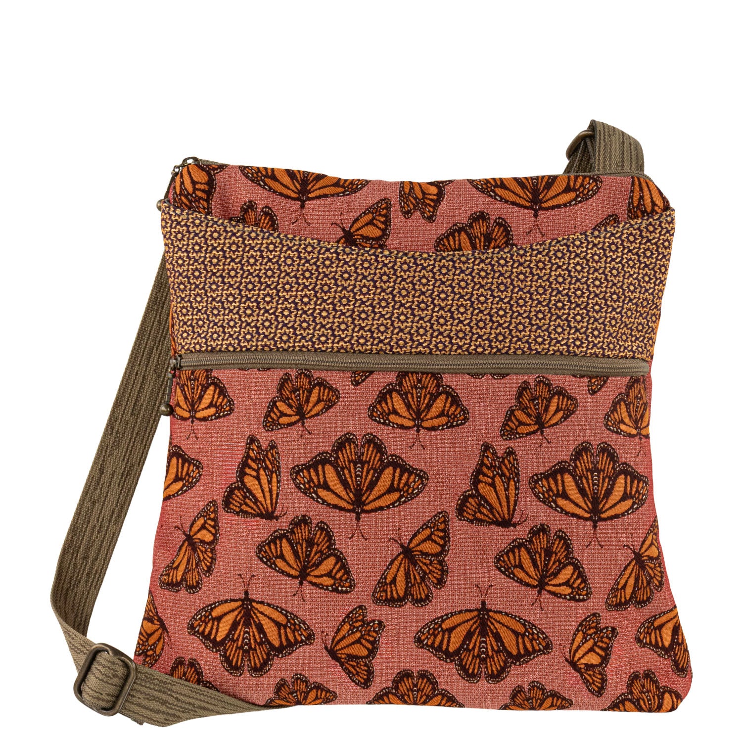 A top Favorite! The perfect big little bag! Soft adjustable custom strap! Generous interior, with small open pocket for lippy-goos. Top shallow open exterior pocket for quick easy access. Front zipped pocket. Generous open pocket on back, will hold a water bottle, great bag!