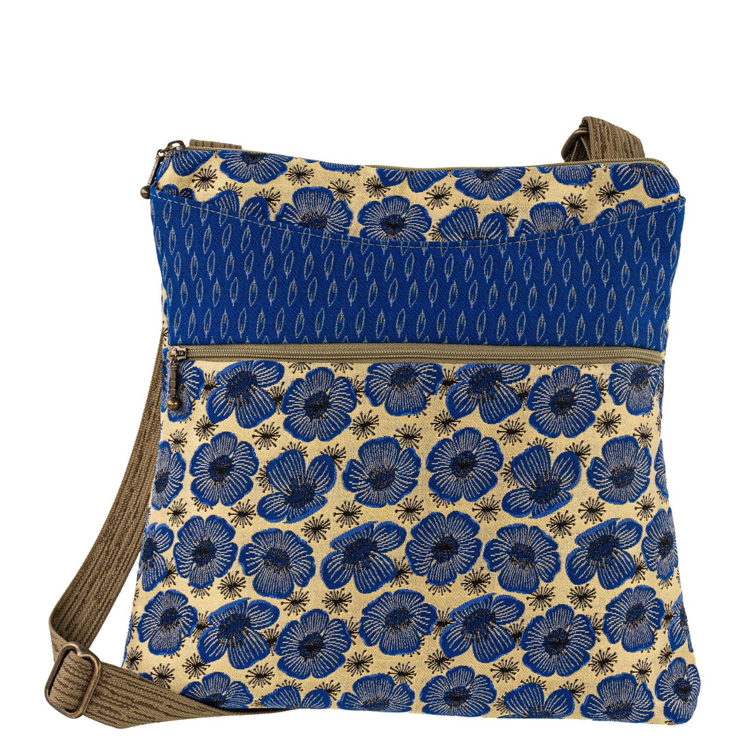 A top Favorite! The perfect big little bag! Soft adjustable custom strap! Generous interior, with small open pocket for lippy-goos. Top shallow open exterior pocket for quick easy access. Front zipped pocket. Generous open pocket on back, will hold a water bottle, great bag!